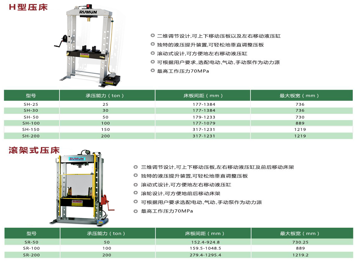 RVMUN SR-200系列200T滾架式液壓壓床技術(shù)特點(diǎn):
